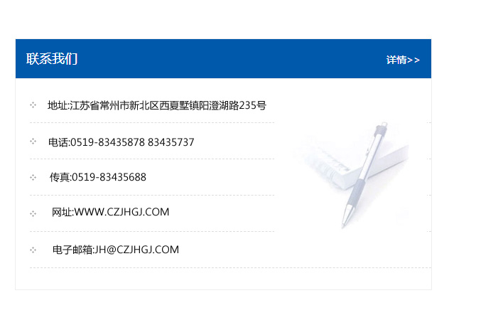 地址:常州市新北區友邦商務大廈1幢16、17層  電話:0519-85101652  傳真:0519-85112595  郵編:213022  網址:www.cz-jiayue_cn.haojunkj.com  郵箱:xiajifengaa@163.com